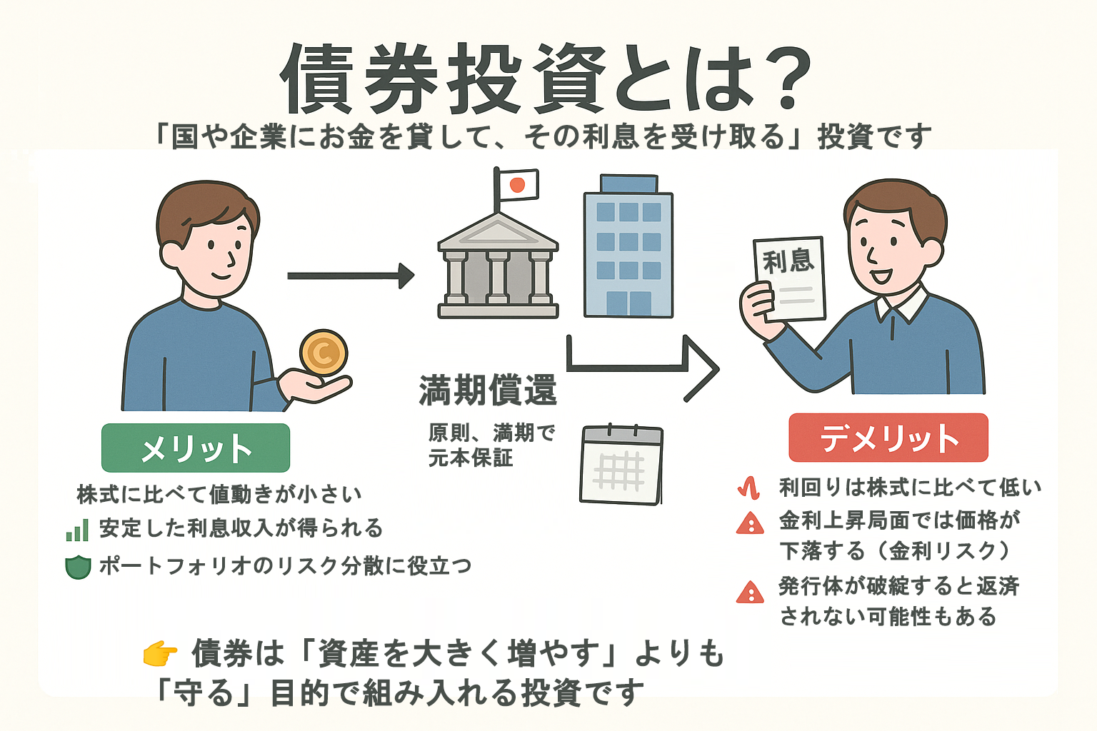 債券を買えば、発行体から利息を受け取り、満期時には元本が返還されます。