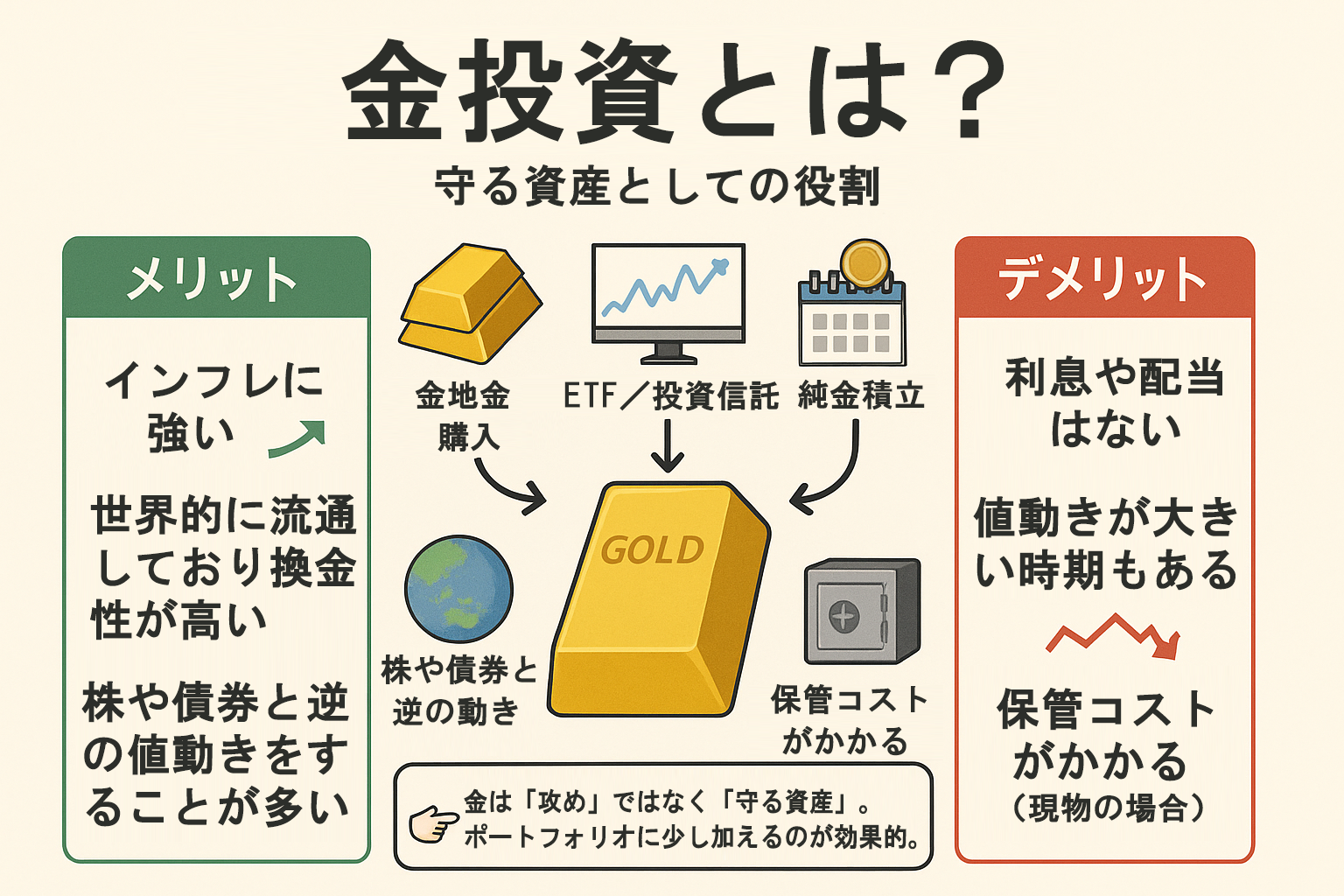 • 投資:時間をかけて資産を育て、企業や社会の成長に伴うリターンを得る。
