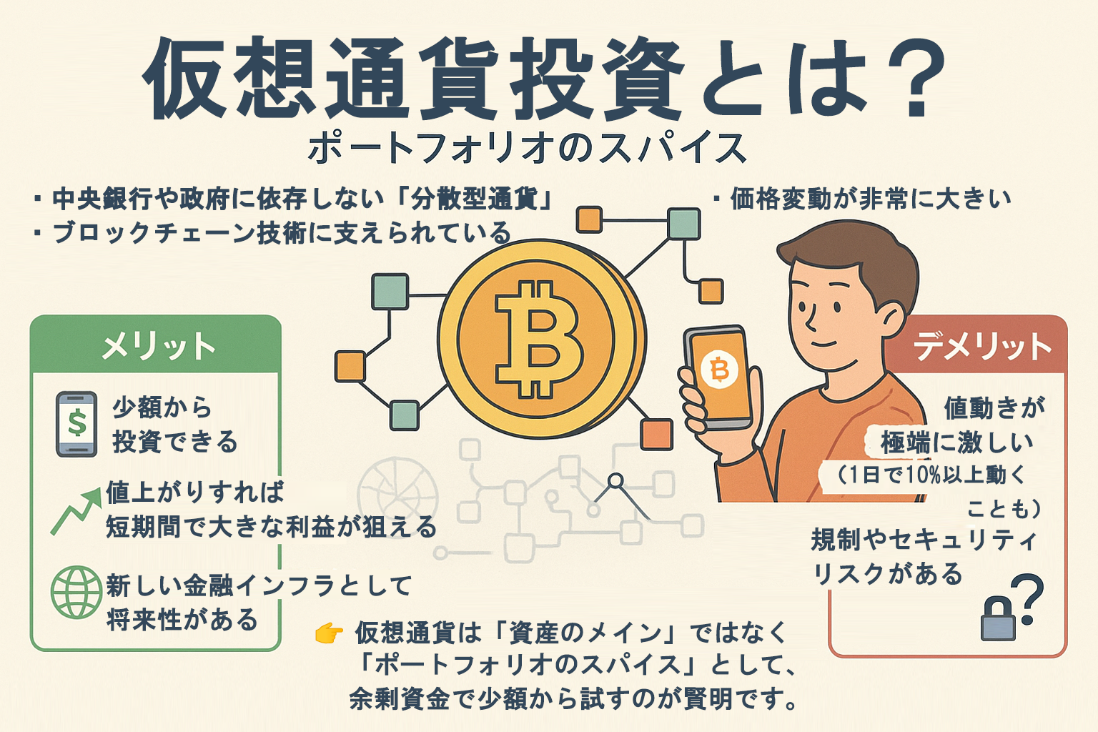 有事や投機的な動きで短期的に大きく値動きすることがあります。長期的には価値を保つ資産ですが、短期投資には不向きです。