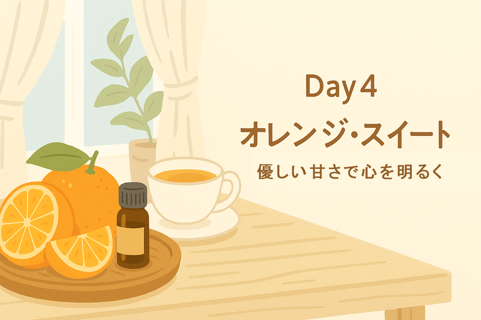 30日で楽しむアロマの香りDay4:「オレンジ・スイート ― 優しい甘さで心を明るく」 オレンジ・スイートの香りを嗅ぐと、まるで太陽の光が差し込むように気持ちがふっと軽くなります。フレッシュで甘く、親しみやすい柑橘の香りは、大人から子どもまで誰にでも好まれるアロマの代表格。「笑顔を取り戻す香り」とも呼ばれ 2025.10.3130日で楽しむアロマの香り