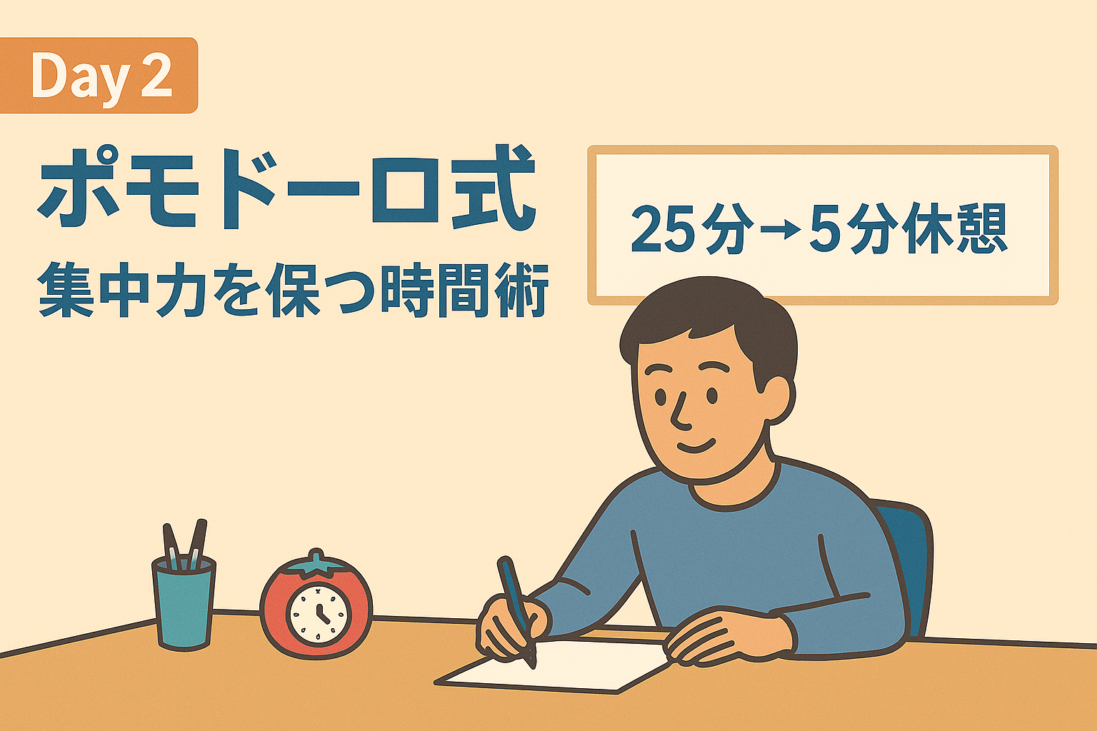 社会人が知ってると便利な方程式Day2:ポモドーロ式(25分+5分休憩) ― 集中力を保つ時間術 「集中力が続かない社会人におすすめ!25分作業+5分休憩のポモドーロ式で効率アップ。勉強・仕事・家事にも応用できる時間術を紹介します。」 2025.10.03社会人が知ってると便利な方程式