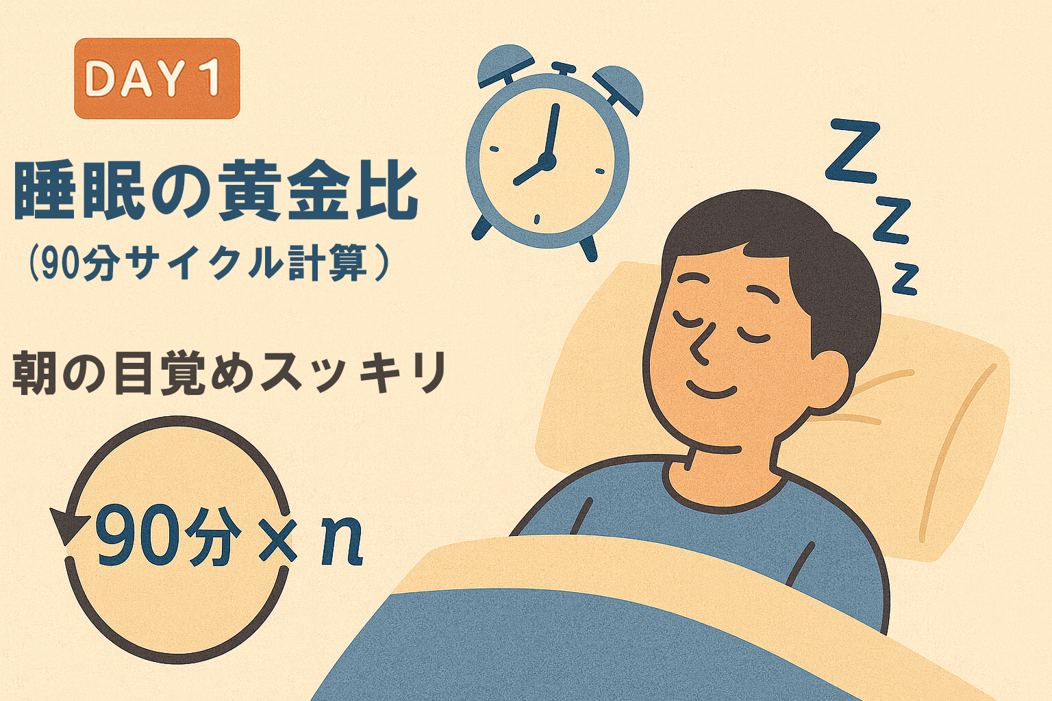 社会人が知ってると便利な方程式Day1:睡眠の黄金比(90分サイクル計算) ― 朝の目覚めをスッキリ 「睡眠の質は量よりリズム!90分サイクルを意識すると朝の目覚めがスッキリ。社会人の自己成長につながる、暮らしに役立つ豆知識方程式を紹介します。」 2025.10.02社会人が知ってると便利な方程式