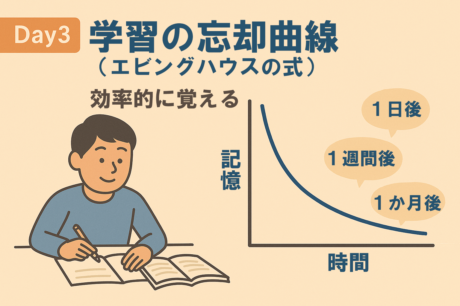 社会人が知ってると便利な方程式Day3:学習の忘却曲線(エビングハウスの式) ― 効率的に覚える 「人はどれくらい忘れるのか?エビングハウスの忘却曲線で学習の効率をアップ。復習タイミングの“1・1・7・30”ルールで記憶を定着させる方法を紹介します。」 2025.10.04社会人が知ってると便利な方程式