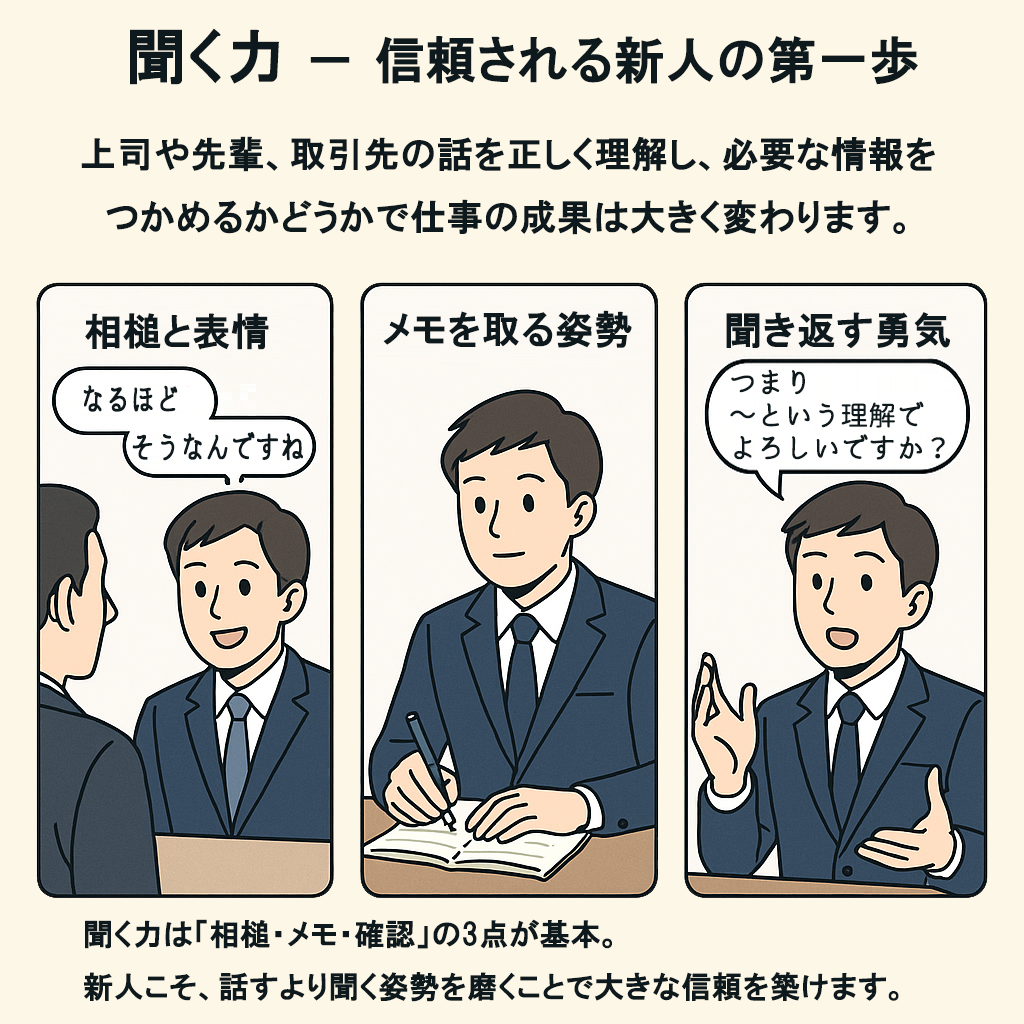 社会人になると、プレゼンや報告といった「話す場面」が注目されがちですが、実はそれ以上に大切なのが「聞く力」です。上司や先輩、取引先の話を正しく理解できなければ、どんなに良い意見を持っていても仕事は進みません。新人にとって「安心して任せられる」と思われるかどうかは、聞く姿勢にかかっていると言っても過言ではありません。