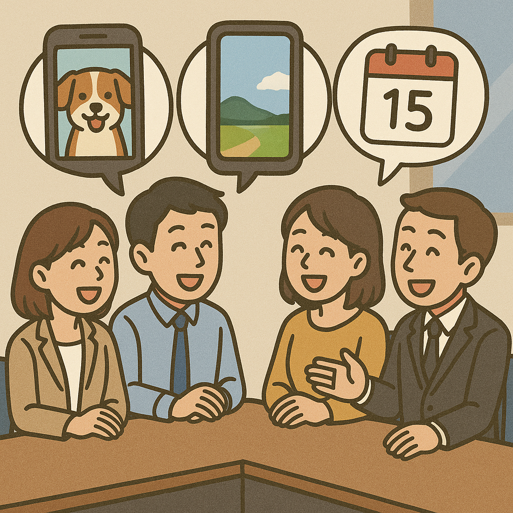 スマホは誰もが持ち歩く身近なアイテム。その「待ち受け画面」をテーマにすると、ちょっとユニークで親しみやすいアイスブレイクになります。写真やイラスト、ペットや家族の姿など、その人のこだわりや大切にしているものが垣間見える話題です。