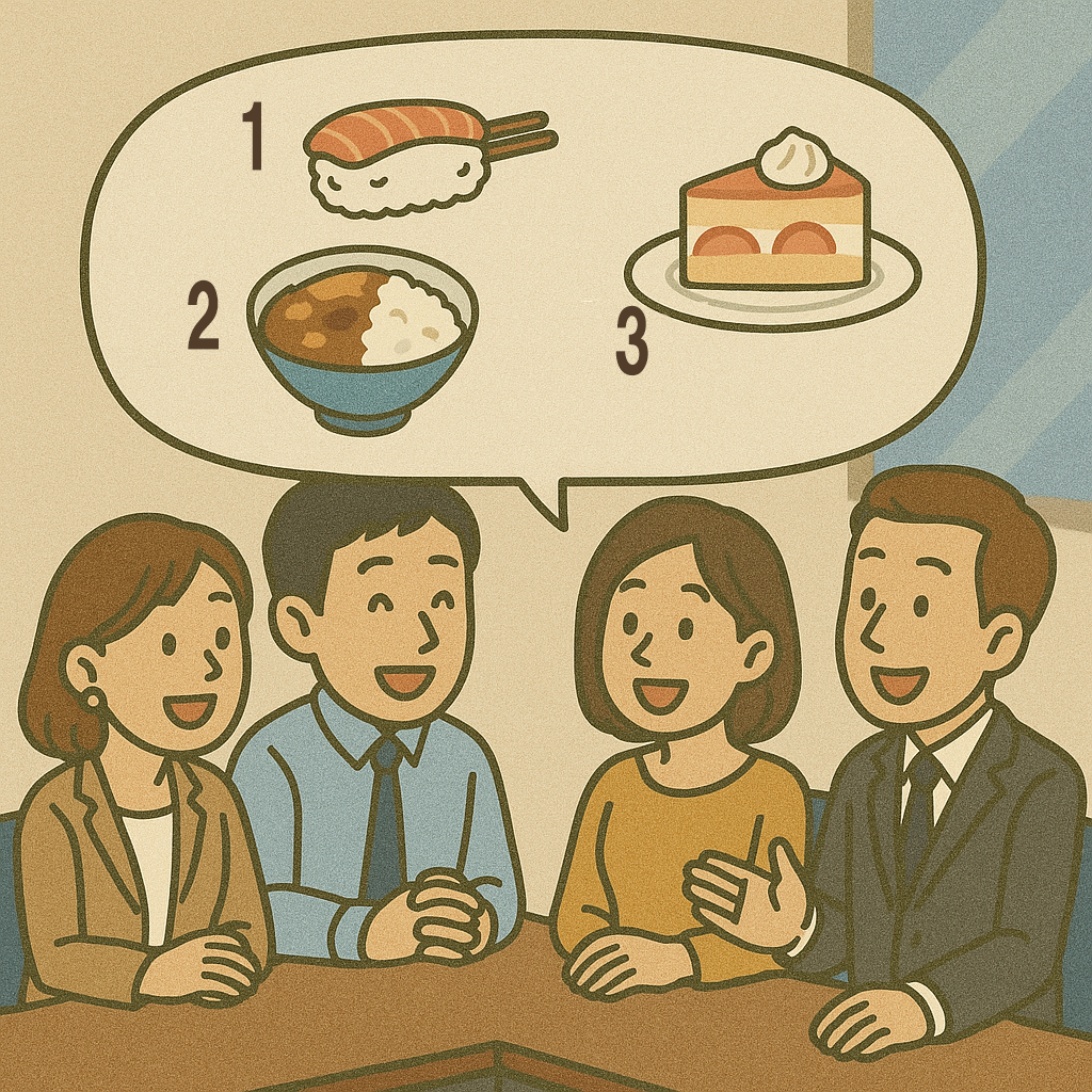 「好きな食べ物ランキング」は、誰でも答えやすく、ユーモアも混じる万能アイスブレイクです。会話の糸口として取り入れることで、チームの雰囲気を和やかにするのに役立ちます。