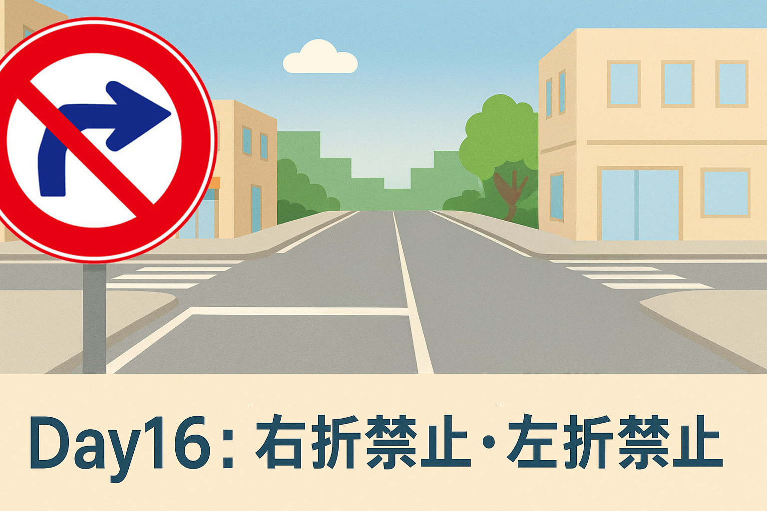 Day16では、右折禁止・左折禁止の正しい意味と、時間帯指定の読み方、事故防止のポイントを整理していきます。
