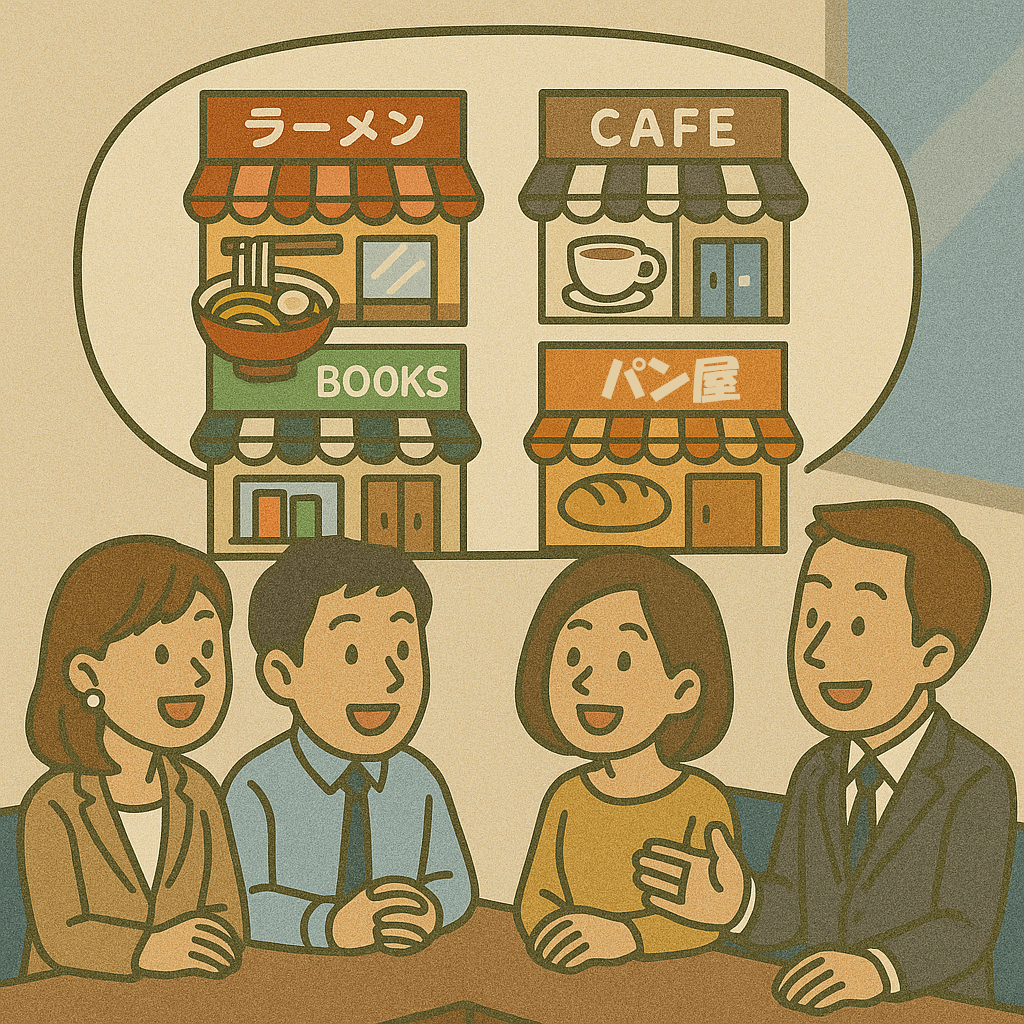 自己紹介の場で「行きつけのお店」をテーマにすると、親しみやすく、実用的な情報交換にもなるアイスブレイクになります。飲食店はもちろん、書店やカフェ、雑貨屋などでもOK。地域性や趣味が表れるので、会話が自然に広がります。