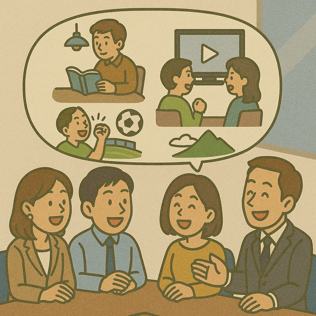 「好きな休日の過ごし方」は、趣味やライフスタイルを共有できる万能のアイスブレイクです。共感が生まれやすく、リラックスした雰囲気をつくるのに最適なテーマといえるでしょう。