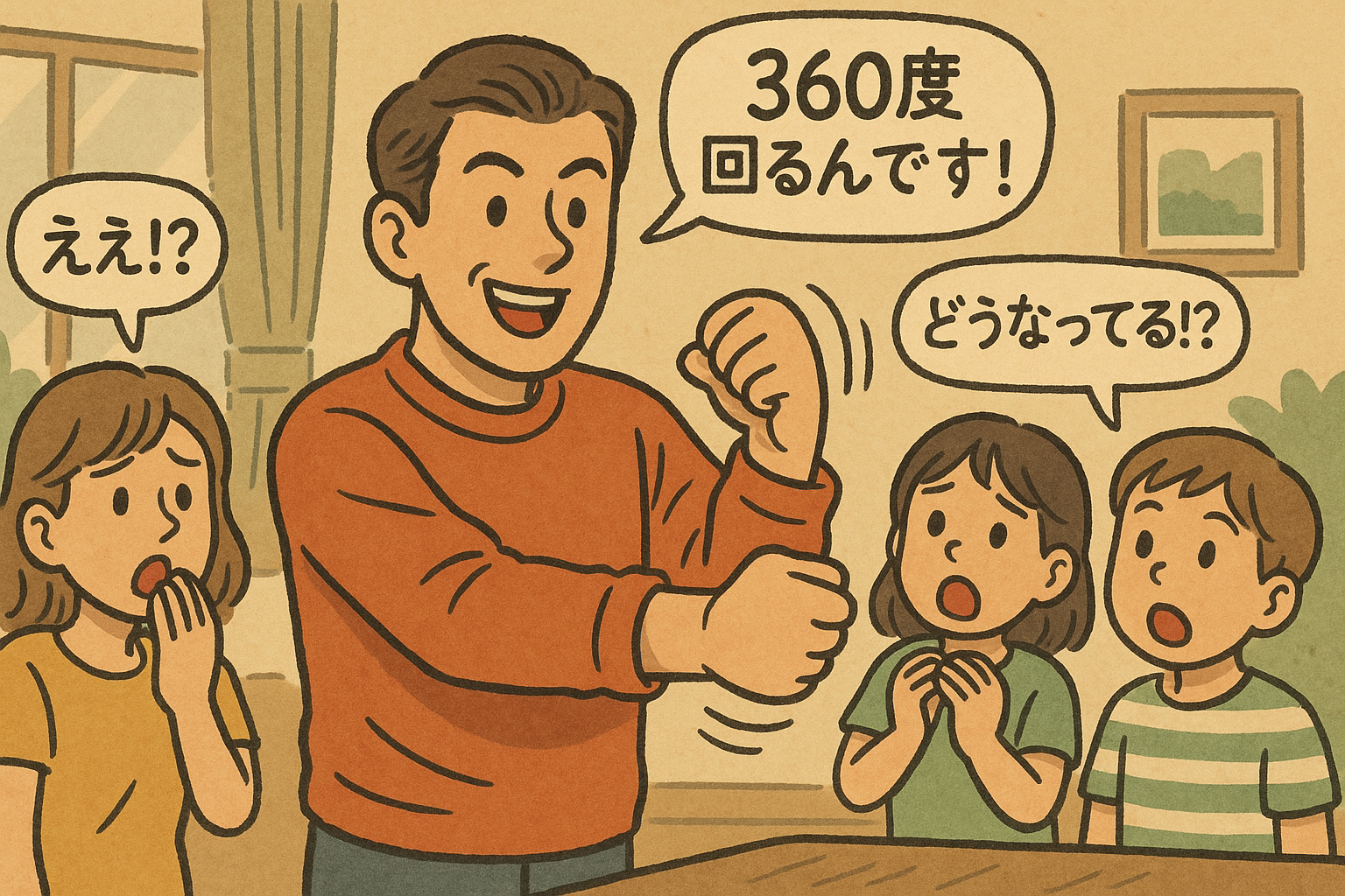 袖で隠れているため、実際よりも“手首だけがぐるぐる回っているように”見えるのです。 - 「360度回る手首です!」と演出