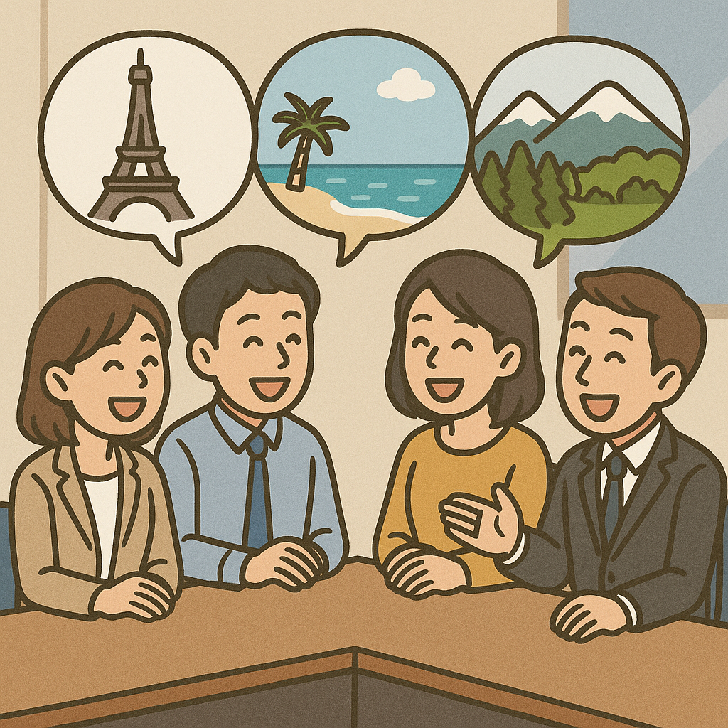アイスブレイクDay9:行ってみたい旅行先 Day9は「行ってみたい旅行先」。夢や憧れを共有することで、ポジティブな雰囲気を生み、会話を広げやすいアイスブレイクです。 2025.10.09アイスブレイク